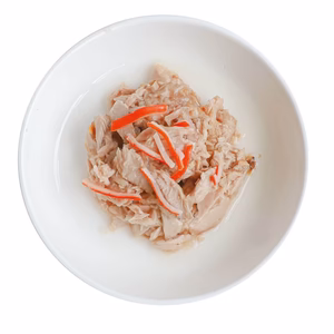 Atún fresco deshuesado 38.25%, Cangrejo (Surimi) 2.5%, Fructooligosacáridos 60mg/kg, cloruro de potasio. Pienso complementario para gatos.